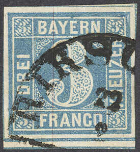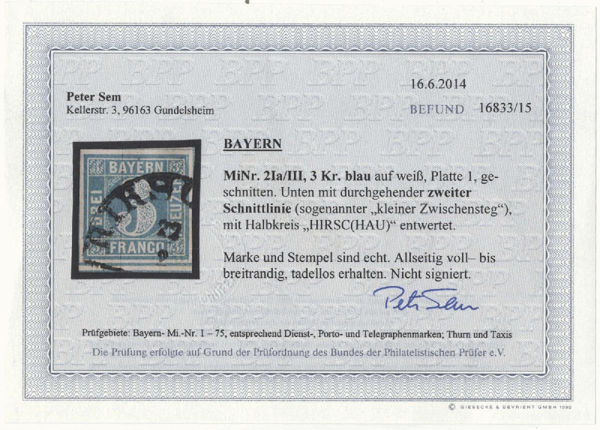 | Zusatzinformationen und Suchstichworte: | 72. Deider Auktion 29. Juni - 1. Juli 2023 Los 1047 Altdeutschland Bayern 3 Kr. blau, Pl. 1, allseits breitrandiges Luxusstück mit allen Schnittlinien, unten mit durchgehender zweiter Schnittlinie, sog. "kleiner Zwischensteg" und klarem HKS "HIRSC(HAU) 22/2" Ausruf 200,00 EUR |