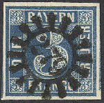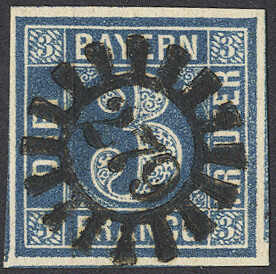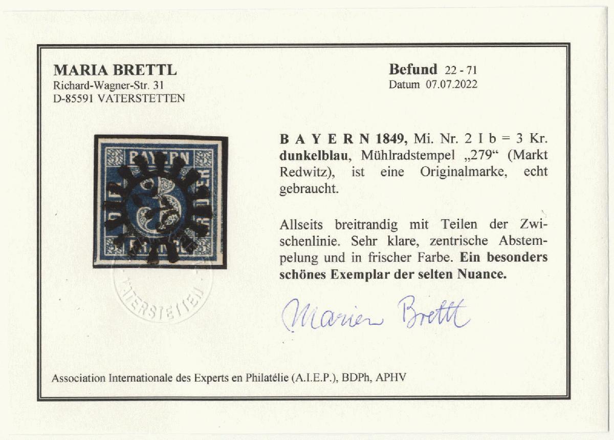 | Zusatzinformationen und Suchstichworte: | 72. Deider Auktion 29. Juni - 1. Juli 2023 Los 1048 Altdeutschland Bayern 3 Kr. dunkelblau, Pl. 1, allseits breitrandiges Luxusstück in frischer Farbe und sehr klarem, zentr. Stpl. "279" (Markt Redwitz), neuer Fotobefund Brettl: "Ein besonders schönes Exemplar der seltenen Nuance" Ausruf 90,00 EUR |