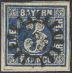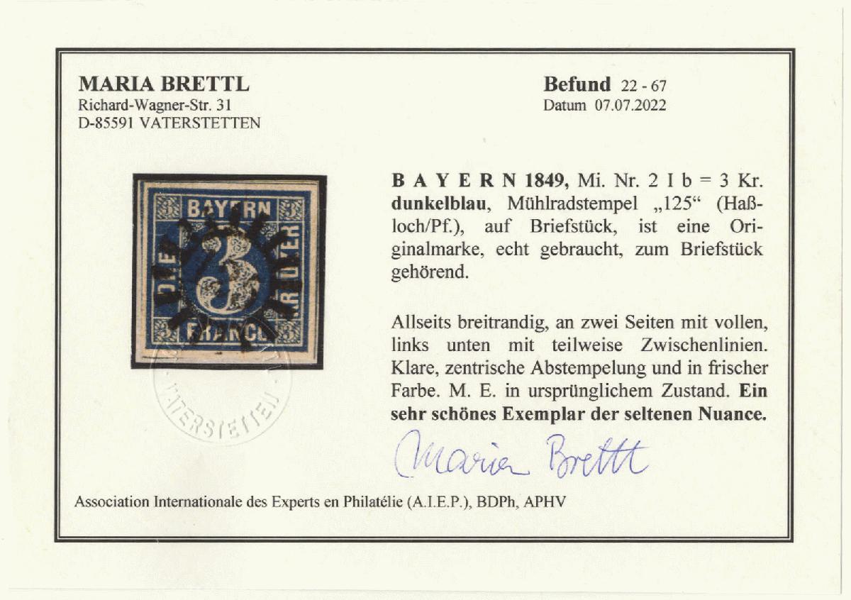 | Zusatzinformationen und Suchstichworte: | 72. Deider Auktion 29. Juni - 1. Juli 2023 Los 1051 Altdeutschland Bayern 3 Kr. dunkelblau, Pl. 1, allseits breitrandiges Luxusstück mit allen Schnittlinien und in frischer Farbe, klar und zentrisch entwertet "125" (Haßloch/Pf.), neuer Fotobefund Brettl: "Ein sehr schönes Exemplar der seltenen Nuance" Ausruf 80,00 EUR |