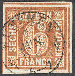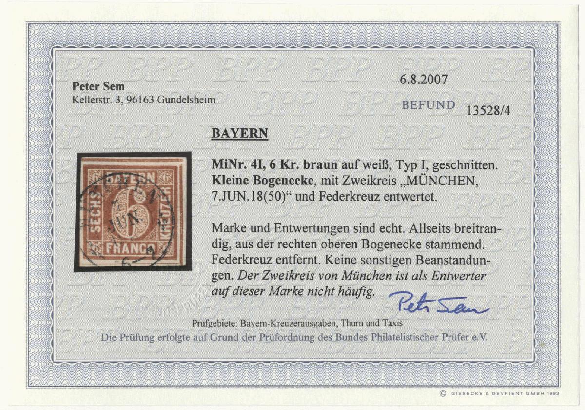 | Zusatzinformationen und Suchstichworte: | 72. Deider Auktion 29. Juni - 1. Juli 2023 6 Kr. braun, Type I, voll- bis sehr breitrandig mit drei vollen Schnittlinien aus der rechten oberen Bogenecke mit klarem, nicht häufigem Zweikreisstpl. "MÜNCHEN 7. JUN. 18(50)", Federkreuz entfernt, sonst tadellos Ausruf 150,00 EUR |
