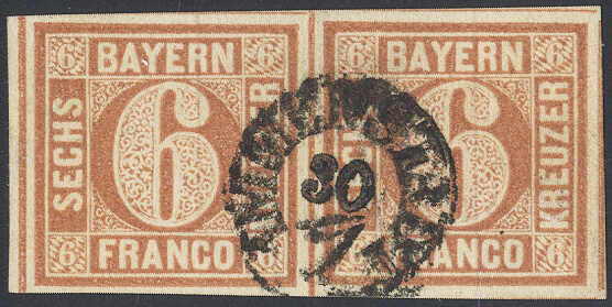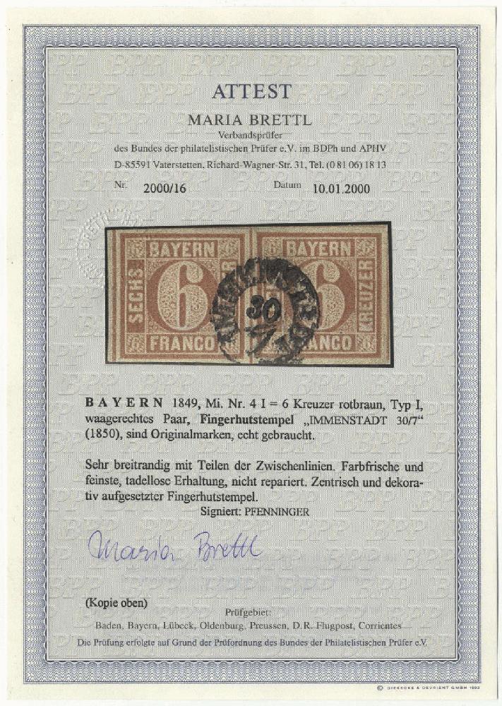 | Zusatzinformationen und Suchstichworte: | 72. Deider Auktion 29. Juni - 1. Juli 2023 Los 1062 Altdeutschland Bayern 6 Kr. rotbraun, Typ I, allseits breitrandiges Luxuspaar mit dekorativ aufgesetztem Fingerhutstempel "IMMENSTADT 30/7" Ausruf 700,00 EUR |