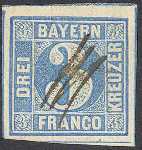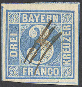 | Zusatzinformationen und Suchstichworte: | 72. Deider Auktion 29. Juni - 1. Juli 2023 Los 1078 Altdeutschland Bayern 3 Kr. blau, Pl. 5, voll- bis breitrandiges Kabinettstück mit allen Schnittlinien und PLF VII "schräger weißer Kratzer durch linken Schriftkasten (DREI)" und fiskalischer Entwertung Ausruf 40,00 EUR |