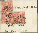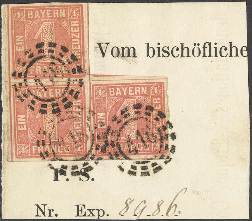 | Zusatzinformationen und Suchstichworte: | 72. Deider Auktion 29. Juni - 1. Juli 2023 Los 1101 Altdeutschland Bayern 1 Kr. rosa im meist breitrandigen Dreierblock (kl. Einschnitt) auf dekorativem Briefstück mit MR "418" REGENSBURG Ausruf 120,00 EUR |