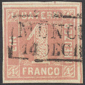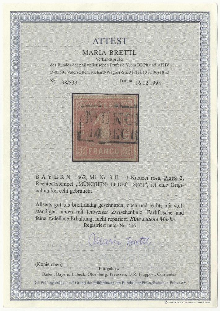 | Zusatzinformationen und Suchstichworte: | 72. Deider Auktion 29. Juni - 1. Juli 2023 Los 1115 Altdeutschland Bayern 1 Kr. rosa, Pl. 2, voll- bis breitrandiges Kabinettstück mit Schnittlinien an drei Seiten und Rechteckstpl. "MÜNC(HEN) 14 DEC 18(62)", farbfrisches Exemplar dieser seltenen Marke, reg. unter No. 416 Ausruf 800,00 EUR |