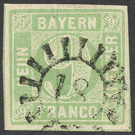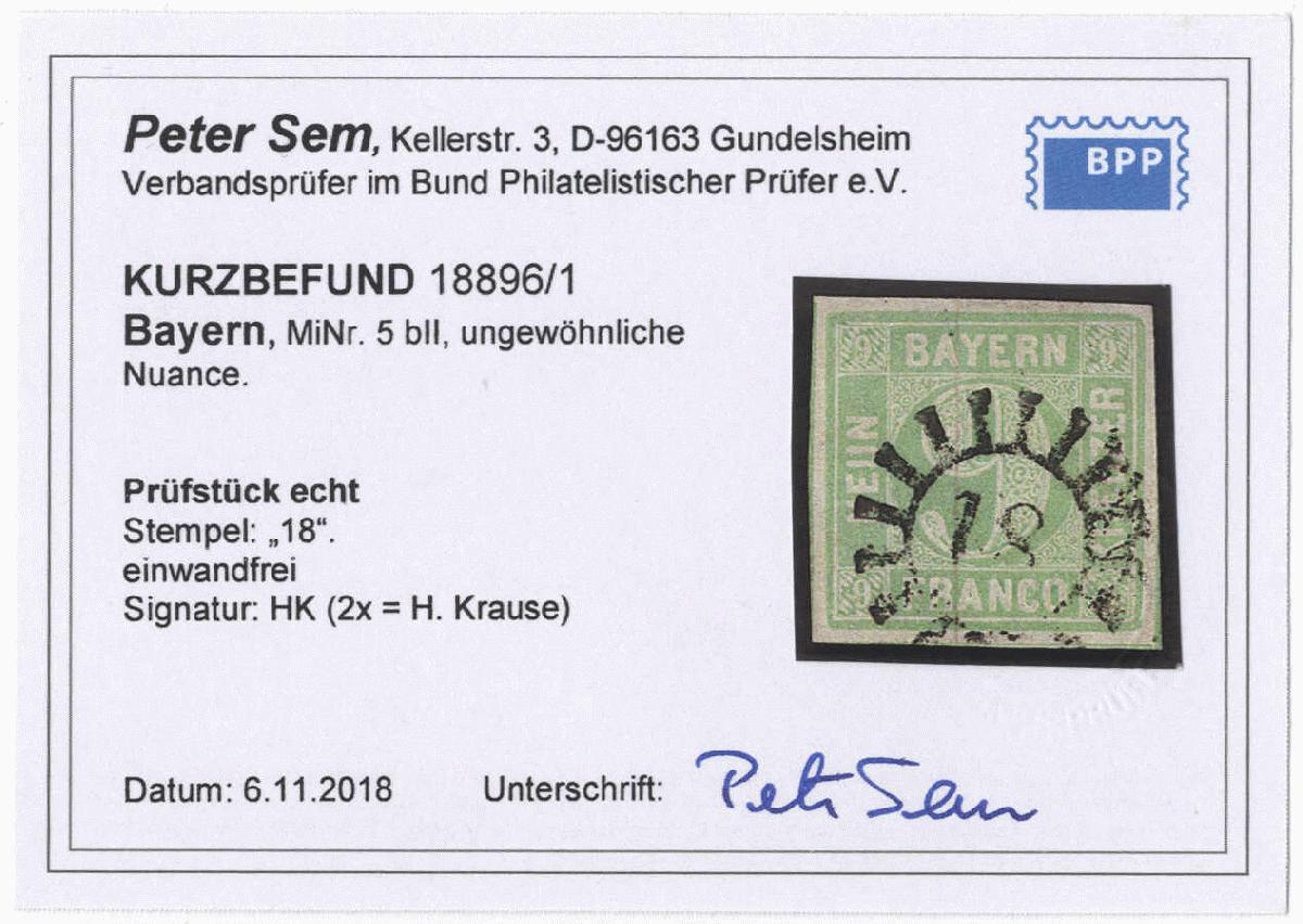 | Zusatzinformationen und Suchstichworte: | 72. Deider Auktion 29. Juni - 1. Juli 2023 Los 1138 Altdeutschland Bayern 9 Kr. blaugrün, Type II, voll- bis breitrandiges Kabinettstück mit klarem Stpl. "18" (Augsburg), sign. H. Krause, Fotobefund Sem BPP "Ungewöhnliche Nuance" Ausruf 80,00 EUR |