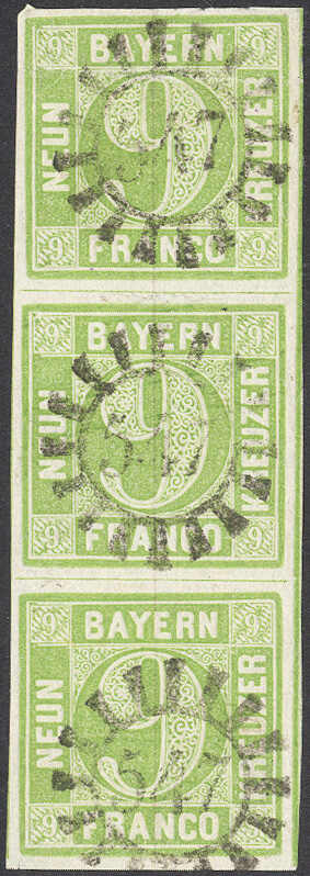 | Zusatzinformationen und Suchstichworte: | 72. Deider Auktion 29. Juni - 1. Juli 2023 Los 1145 Altdeutschland Bayern 9 Kr. maigrün, Type III, allseits breitrandiger, senkr. Dreierstreifen, mittlere und untere Marke tadellos, obere Marke waager. Bug, mit klarem, zentr. MR "547" Ausruf 150,00 EUR |