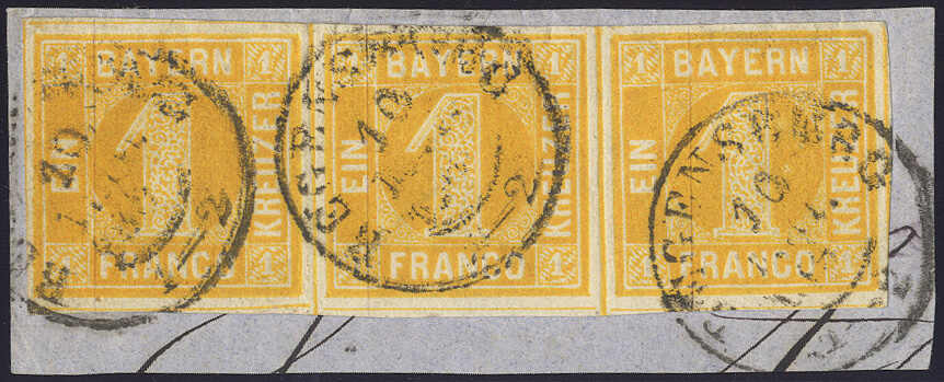 | Zusatzinformationen und Suchstichworte: | 72. Deider Auktion 29. Juni - 1. Juli 2023 Los 1188 Altdeutschland Bayern 1 Kr. orangegelb, waagerechter, allseits breitrandiger Luxus-Dreierstreifen mit nahezu allen Schnittlinen und OPA-Stpl. "REGENSBURG 10. MAI 186." Ausruf 180,00 EUR |