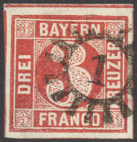 | Zusatzinformationen und Suchstichworte: | 72. Deider Auktion 29. Juni - 1. Juli 2023 Los 1207 Altdeutschland Bayern 3 Kr. tiefrot/karmin, allseits breitrandiges Luxusstück mit drei Schnittlinien und sehr klarem "1" (Abbach) Ausruf 40,00 EUR |