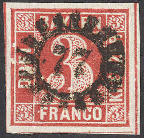 | Zusatzinformationen und Suchstichworte: | 72. Deider Auktion 29. Juni - 1. Juli 2023 Los 1210 Altdeutschland Bayern 3 Kr. tiefrot/karmin, allseits breitrandig mit Schnittlinien rechts und unten, mehrere kl. Leimfleckchen (kl. Eckbug, sonst tadellos) mit sehr klarem, zentr. Stpl. "77" (Deggendorf) Ausruf 30,00 EUR |
