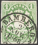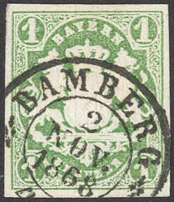 | Zusatzinformationen und Suchstichworte: | 72. Deider Auktion 29. Juni - 1. Juli 2023 Los 1262 Altdeutschland Bayern 1 Kr. dunkelgrün, voll- bis breitrandiges Kabinettstück mit sehr klarem OPA-Stempel "BAMBERG 2 NOV. 1868" Ausruf 30,00 EUR |