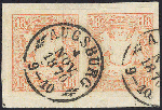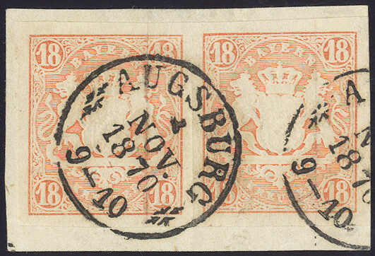 | Zusatzinformationen und Suchstichworte: | 72. Deider Auktion 29. Juni - 1. Juli 2023 Los 1299 Altdeutschland Bayern 18 Kr. ziegelrot, breitrandiges, waager. Luxuspaar (Vortrennschnitt nur im Zwischenraum), farbfrisch mit glasklarem OPA "AUGSBURG", sign. Pfenninger, Fotoattest Sem BPP "eine frisch- und sehr wirkungsvoll erhaltene Einheit". Ausruf 480,00 EUR |