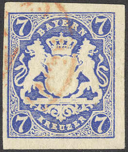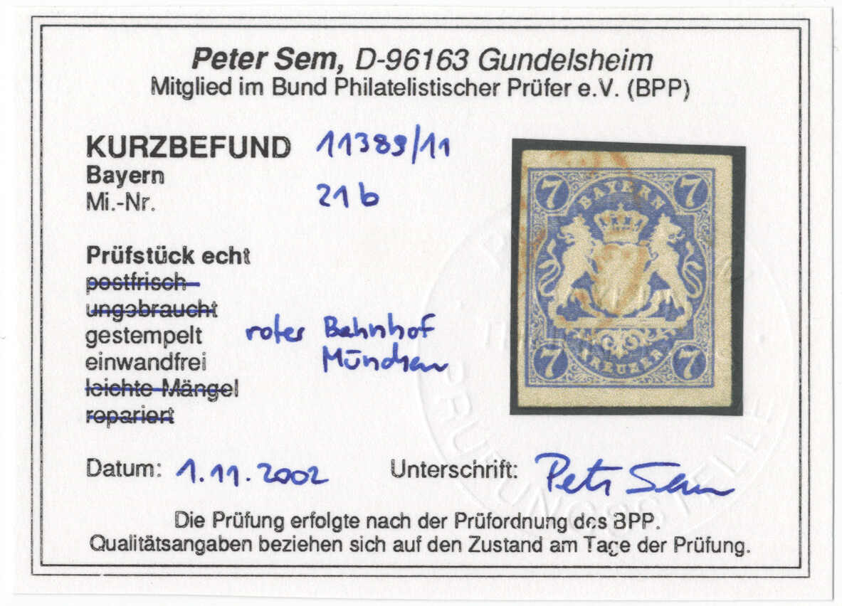 | Zusatzinformationen und Suchstichworte: | 72. Deider Auktion 29. Juni - 1. Juli 2023 Los 1311 Altdeutschland Bayern 7 Kr. dunkelultramarin, voll- bis meist breitrandiges Prachtstück mit rotem Einkreisstpl. "Bahnhof München" Ausruf 50,00 EUR |