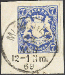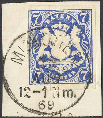 | Zusatzinformationen und Suchstichworte: | 72. Deider Auktion 29. Juni - 1. Juli 2023 Los 1315 Altdeutschland Bayern 7 Kr. preußischblau, besonders farbfrisches Luxus-Briefstück in leuchtender Farbe mit vollem K1 "MÜNCHEN 22. AUG. 69" Ausruf 380,00 EUR |