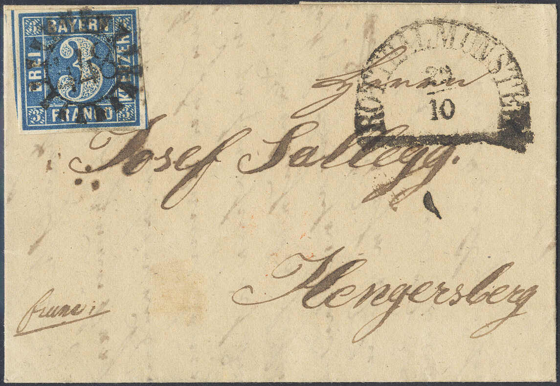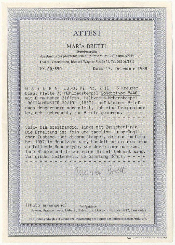 | Zusatzinformationen und Suchstichworte: | 72. Deider Auktion 29. Juni - 1. Juli 2023 Los 1480 Altdeutschland Bayern "448" in der großen Sondertype von ROTTHALMÜNSTER, enorm seltener Mühlradstempel auf kleinem Luxusbrief 3 Kr. blau, Pl. 3 Ausruf 3.800,00 EUR |