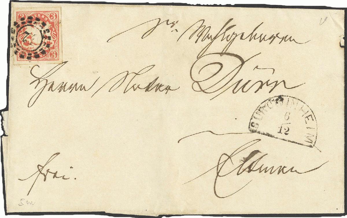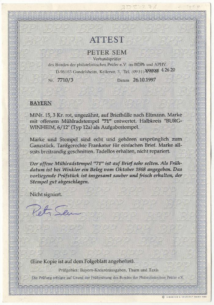 | Zusatzinformationen und Suchstichworte: | 72. Deider Auktion 29. Juni - 1. Juli 2023 Los 1537 Altdeutschland Bayern "71" BURGWINHEIM, klarer Stempel auf allseits breitrandigem Luxusstück 3 Kr. rosa, mit HKS "BURGWINHEIM 6/12" auf Briefhülle nach Eltman, Fotoattest Sem BPP: "Der offene Mühlradstempel 71 ist auf Brief sehr selten" Ausruf 800,00 EUR |