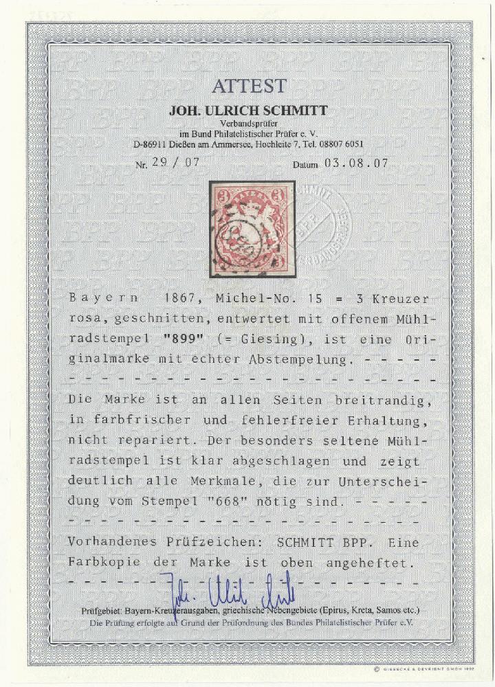 | Prüfer: | Schmitt, Joh. Ulrich (BPP (Bund Philatelistischer Prüfer)) |