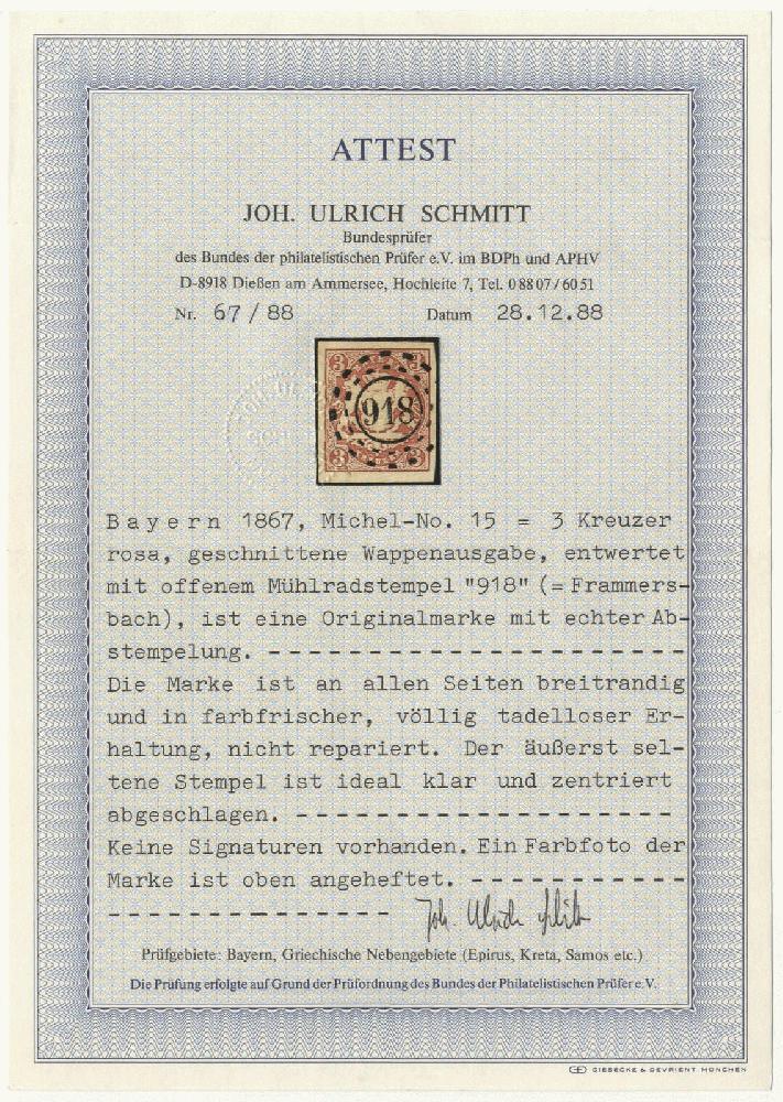 | Zusatzinformationen und Suchstichworte: | 72. Deider Auktion 29. Juni - 1. Juli 2023 Los 1839 Altdeutschland Bayern "918" FRAMMERSBACH, äußerst seltener Stempel ideal klar und zentriert auf Luxusstück 3 Kr. rosa, allseits breitrandig und farbfrisch in völlig tadelloser Erhaltung Ausruf 1.600,00 EUR |