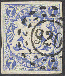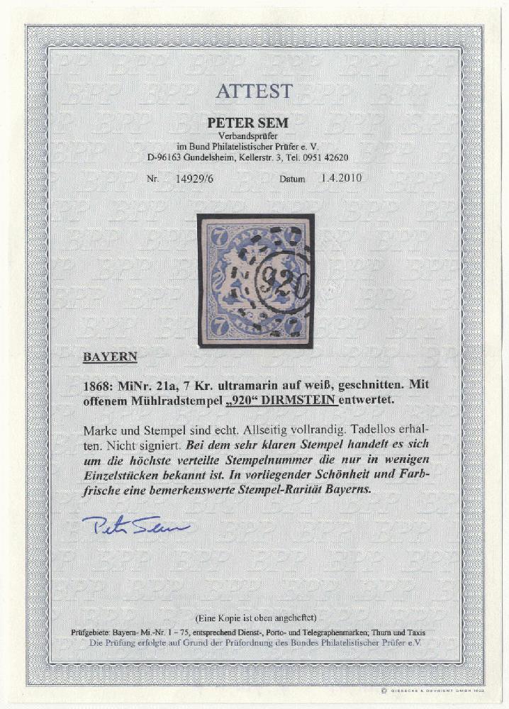| Zusatzinformationen und Suchstichworte: | 72. Deider Auktion 29. Juni - 1. Juli 2023 Los 1841 Altdeutschland Bayern "920" DIRMSTEIN, extrem seltener Stempel sehr klar auf allseits vollrandigem Luxusstück 7 Kr. ultramarin, die höchste verteilte Stempelnummer, die nur in wenigen Einzelstücken bekannt ist, Fotoattest Sem BPP: "In vorliegender Schönheit und Farbfrische eine bemerkenswerte Stempel-Rarität Bayerns". Ausruf 4.000,00 EUR |