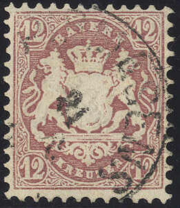 | Zusatzinformationen und Suchstichworte: | 72. Deider Auktion 29. Juni - 1. Juli 2023 Los 1947 Altdeutschland Bayern 12 Kr. lila, enge Rauten, vollzähniges Kabinettstück in kräftiger Farbe mit Einkreisstpl. "PIRMASENS" Ausruf 600,00 EUR |