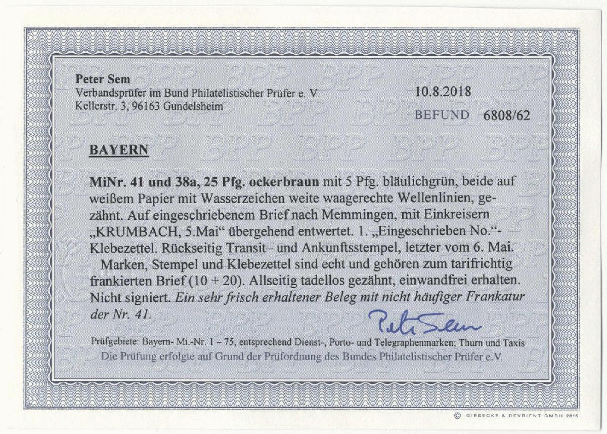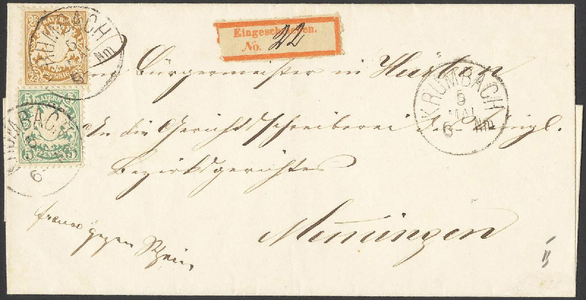 | Zusatzinformationen und Suchstichworte: | 72. Deider Auktion 29. Juni - 1. Juli 2023 Los 1975 Altdeutschland Bayern 5 Pfg. grün und 25 Pfg. ockerbraun auf "Eingeschrieben"-Brief gegen Rückschein von "KRUMBACH" Ausruf 420,00 EUR |