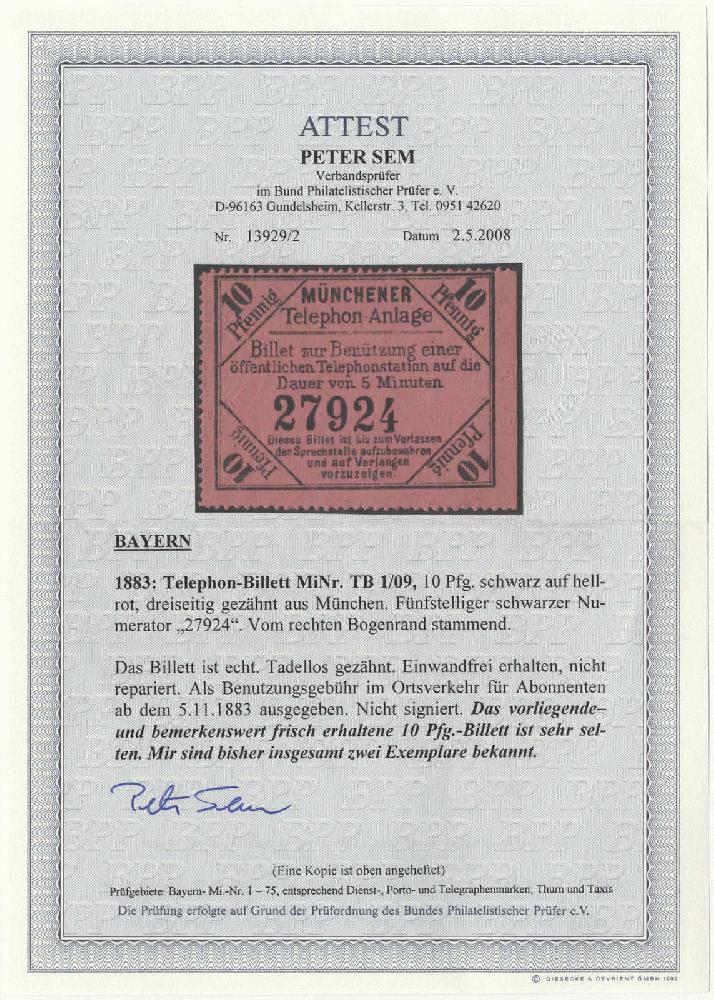 | Prüfgebiet: | Altdeutschland Bayern Telegraphenmarken |