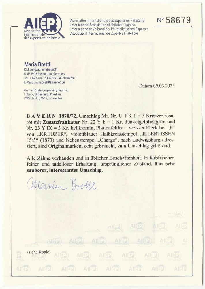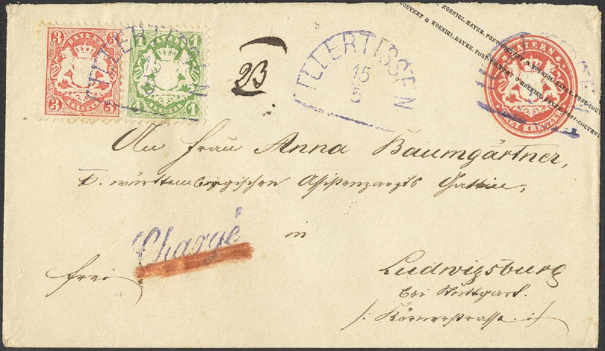| Zusatzinformationen und Suchstichworte: | 72. Deider Auktion 29. Juni - 1. Juli 2023 Los 2081 Altdeutschland Bayern 3 Kr. rosa, Prachtumschlag per "Chargé" mit Zusatzfrankatur 1 Kr. dunkelgelblichgrün und 3 Kr. hellrosa von "ILLERDISSEN" nach Ludwigsburg Ausruf 500,00 EUR |