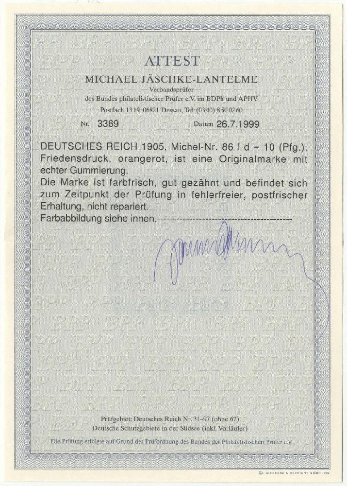 | Prüfer: | Jäschke-Lantelme, Michael (BPP (Bund Philatelistischer Prüfer)) |