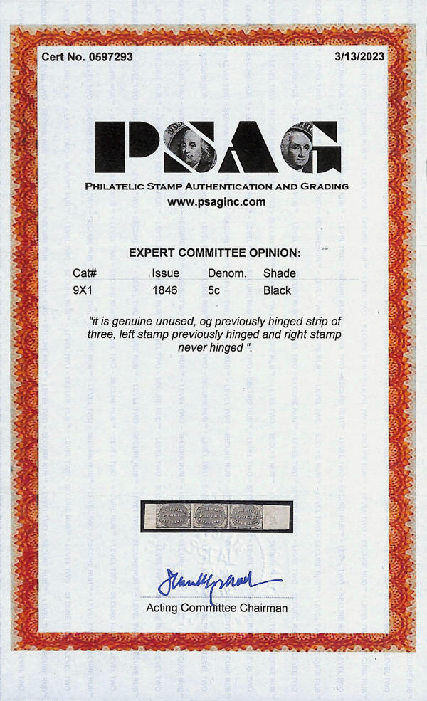 | Zusatzinformationen und Suchstichworte: | Kelleher 781. Auktion 16. - 18. Mai 2023 Los 3443 USA Postmeisterausgaben Providence, R. I. 1846,5¢ grauschwarz (Scott 10X1), volles cross-sheet Dreierstreifen mit seitliche Rand; sauber gedruckt mit Oberrand schmaler bis links berührt; rechte Marke postfrisch, anderen kleiner Falz, feinst bis Pracht, mit 2023 P. S. A. G. Attest (versehentlicher als #9X1). Scott $1,050 und als Einzelmarken Ausruf 150,00 USD |