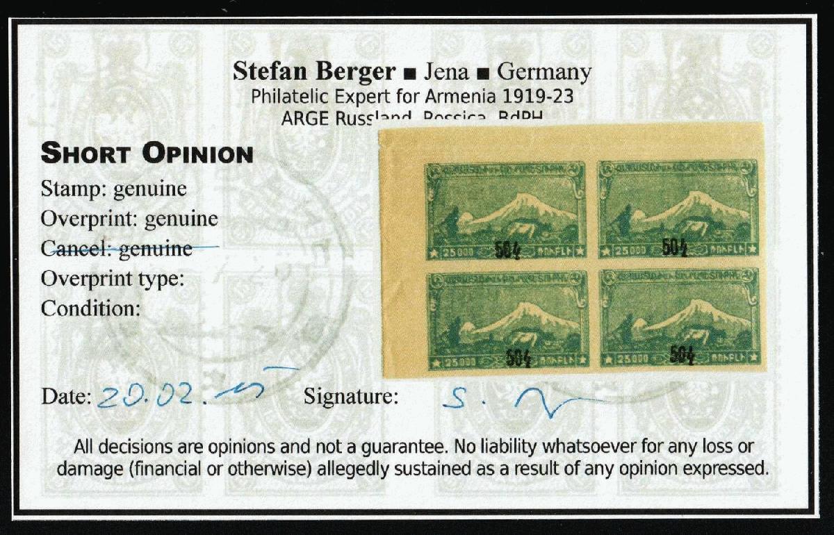 | Zusatzinformationen und Suchstichworte: | Oldlouis 30. Auktion - Russland, Territorien & Ukraine 4 - 7. Juli 2023 Los 517 Armenien 1922 50k auf 25000 R. Armenien aufgewertet, Russland Bürgerkrieg, Viererblock (Sc. 381, Attest, Eckrand, signiert, CV $430, postfrisch). Postfrisch leichter Bug auf Seitenrand. Ausruf 14,00 USD |