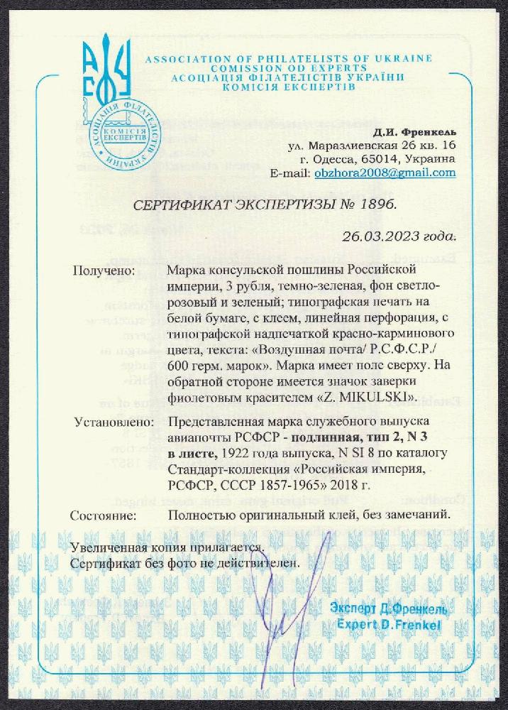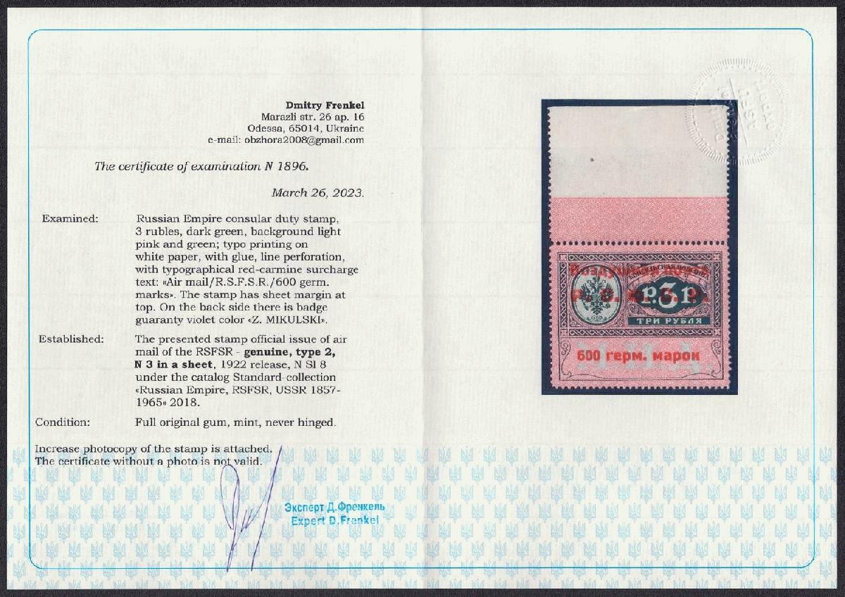 | Zusatzinformationen und Suchstichworte: | Oldlouis 30. Auktion - Russland, Territorien & Ukraine 4 - 7. Juli 2023 Los 651 Sowjetunion Konsulats Marken 1922 600 Germ Mark Konsulatsgebührenmarke, Luftpost, RSFSR, Russland (Zag. SI 8, Zv. C4, Typ II, Position. 3, Attest, signiert, Seitenrand, CV $1,050, postfrisch). Postfrisch Ausruf 150,00 EUR |