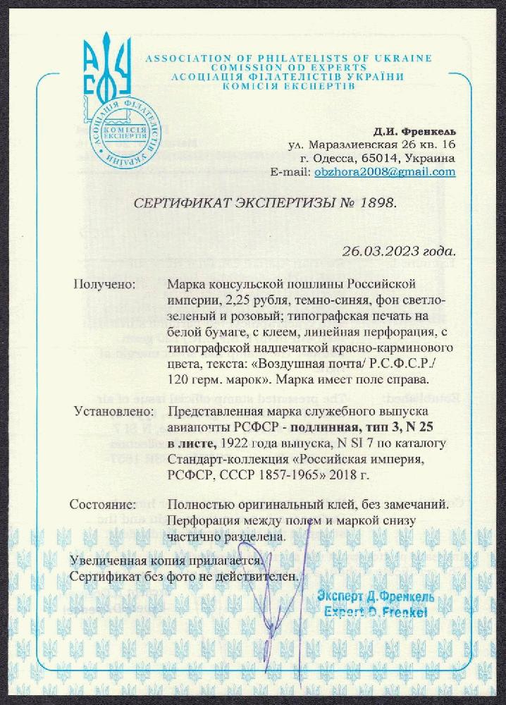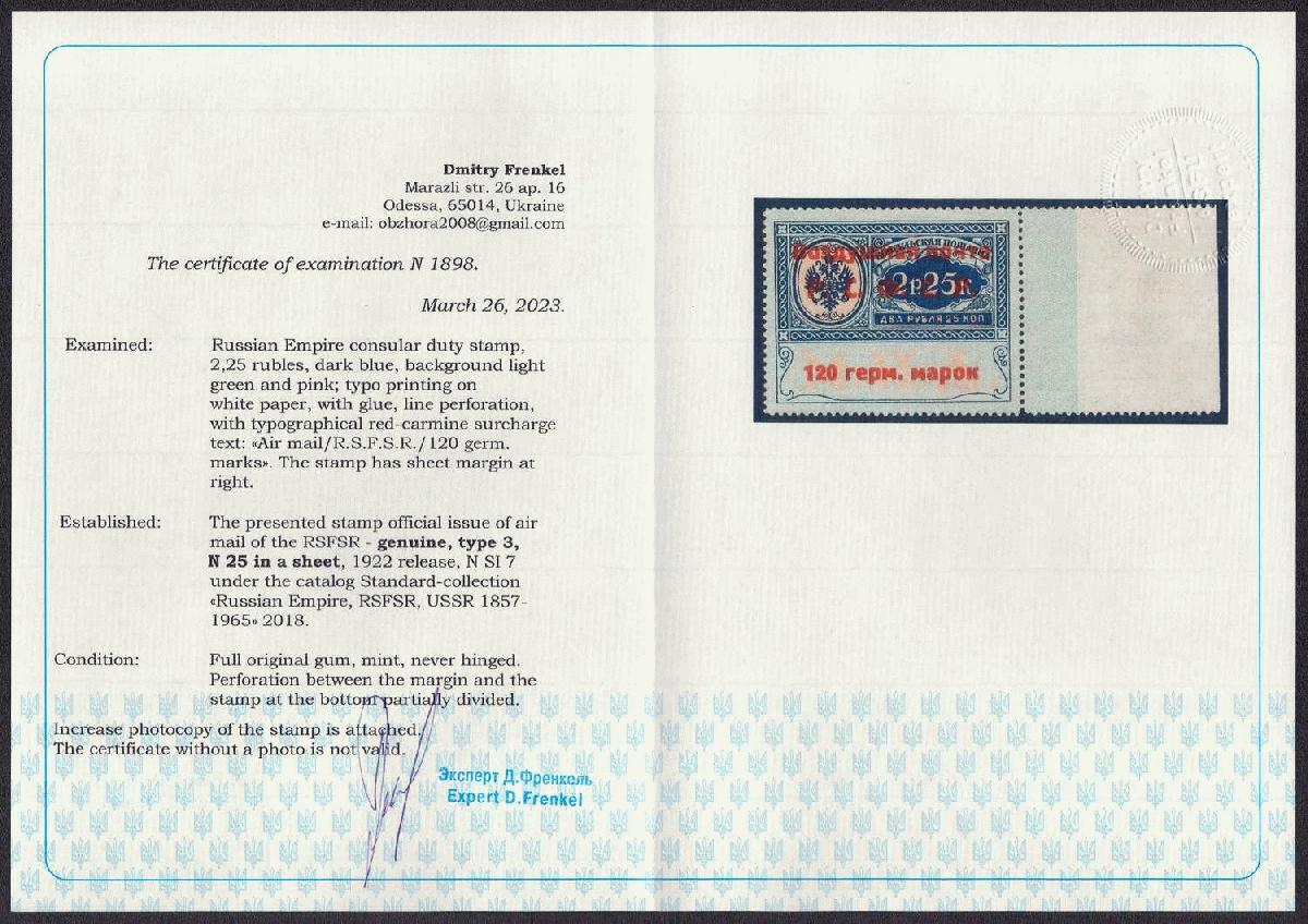 | Zusatzinformationen und Suchstichworte: | Oldlouis 30. Auktion - Russland, Territorien & Ukraine 4 - 7. Juli 2023 Los 649 Sowjetunion Konsulats Marken 1922 120 Germ Mark Konsulatsgebührenmarke, Luftpost, RSFSR, Russland (Zag. SI 7, Zv. C3, Typ III, Position. 25, Attest, signiert, Seitenrand, CV $1,000, postfrisch). Postfrisch groß Zähnung angetrennt. Ausruf 150,00 USD |