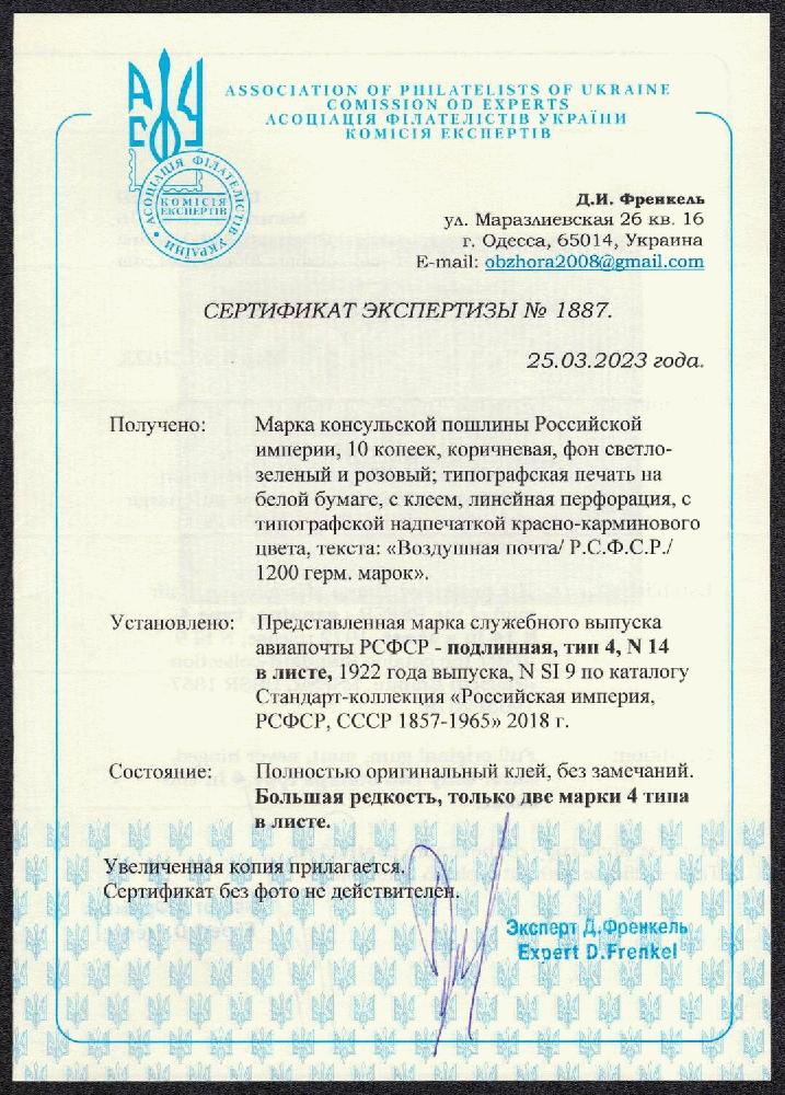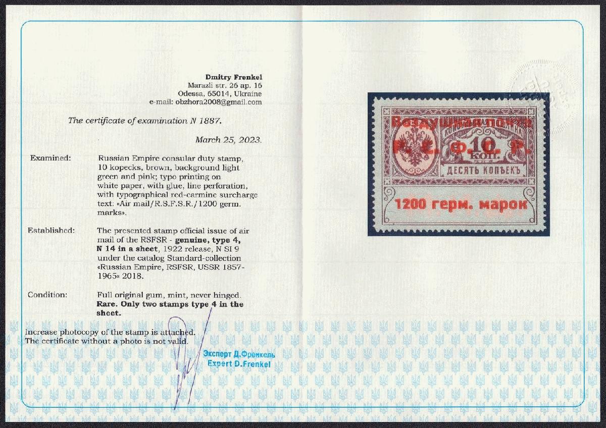 | Zusatzinformationen und Suchstichworte: | Oldlouis 30. Auktion - Russland, Territorien & Ukraine 4 - 7. Juli 2023 Los 659 Sowjetunion Konsulats Marken 1922 1200 Germ Mark Konsulatsgebührenmarke, Luftpost, RSFSR, Russland (Zag. SI 9, Zv. C5, Typ IV, Position. 14, Attest, CV $4,500, postfrisch). Postfrisch Ausruf 500,00 USD |