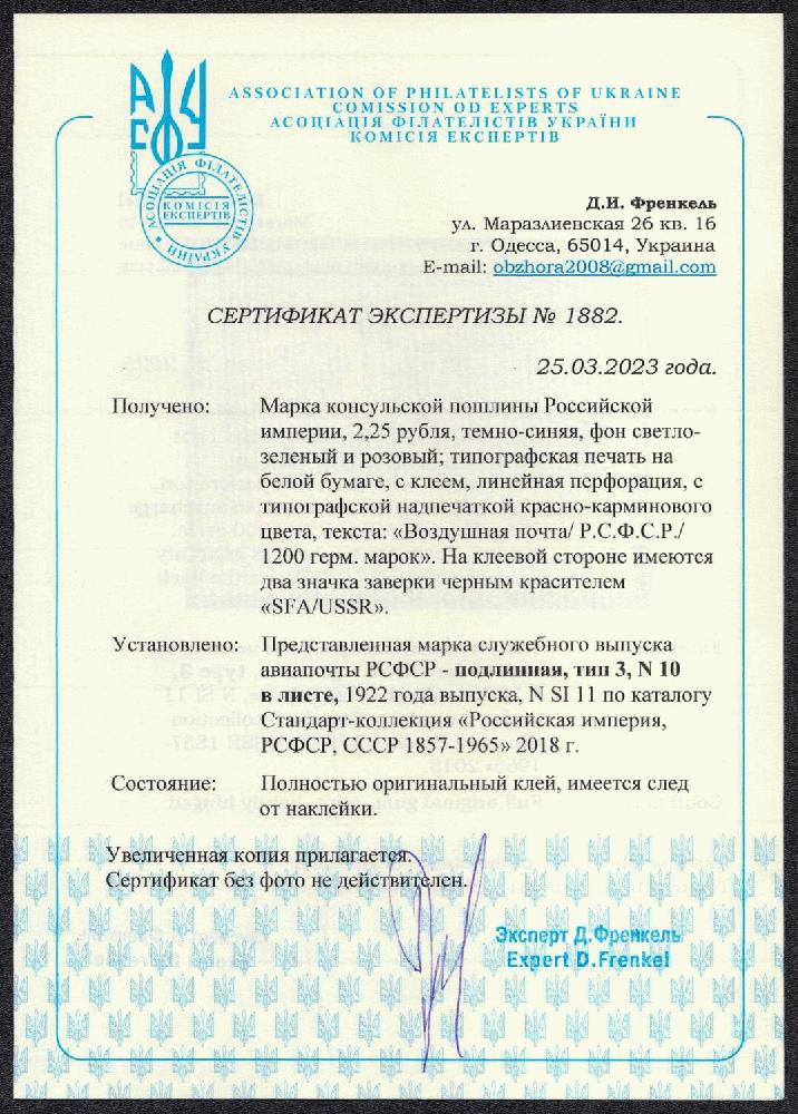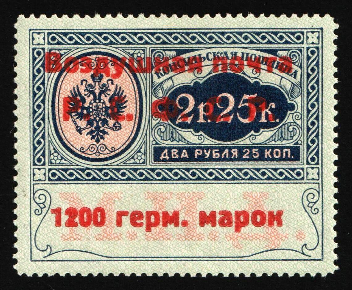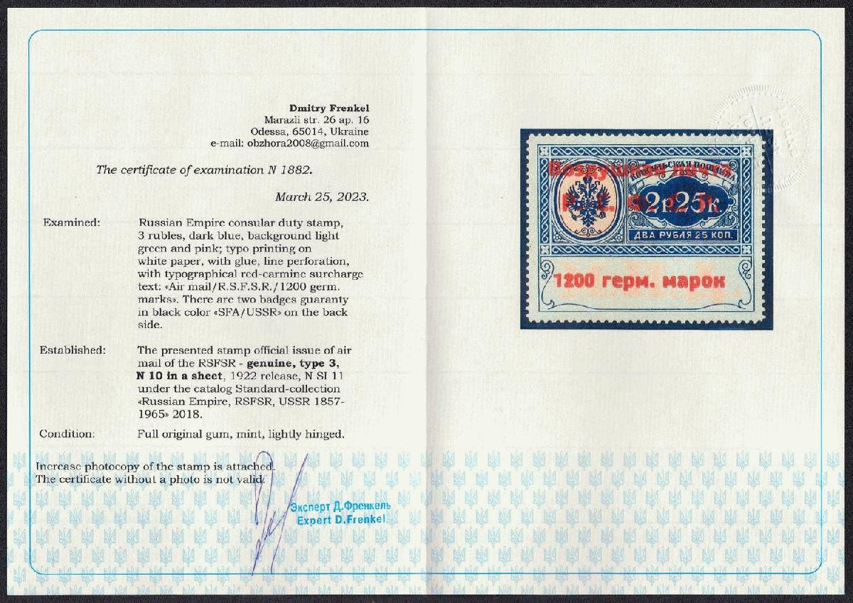 | Zusatzinformationen und Suchstichworte: | Oldlouis 30. Auktion - Russland, Territorien & Ukraine 4 - 7. Juli 2023 Los 664 Sowjetunion Konsulats Marken 1922 1200 Germ Mark Konsulatsgebührenmarke, Luftpost, RSFSR, Russland (Zag. SI 11, Zv. C7, Typ III, Position. 10, Attest, signiert, CV $2,100). Ungebraucht mit kleinem Falz Ausruf 750,00 USD |