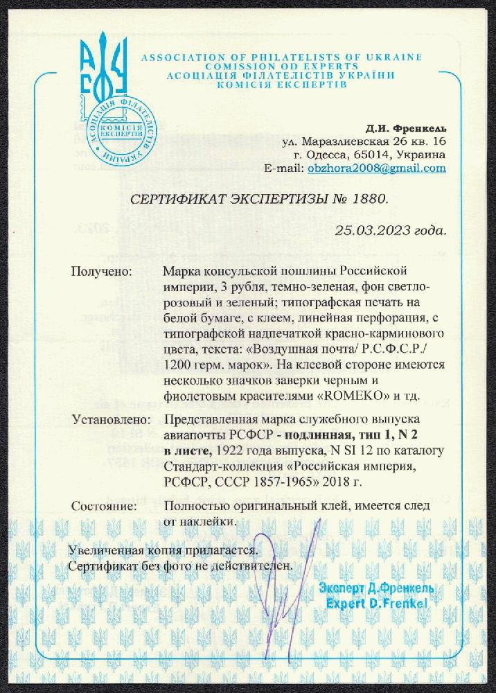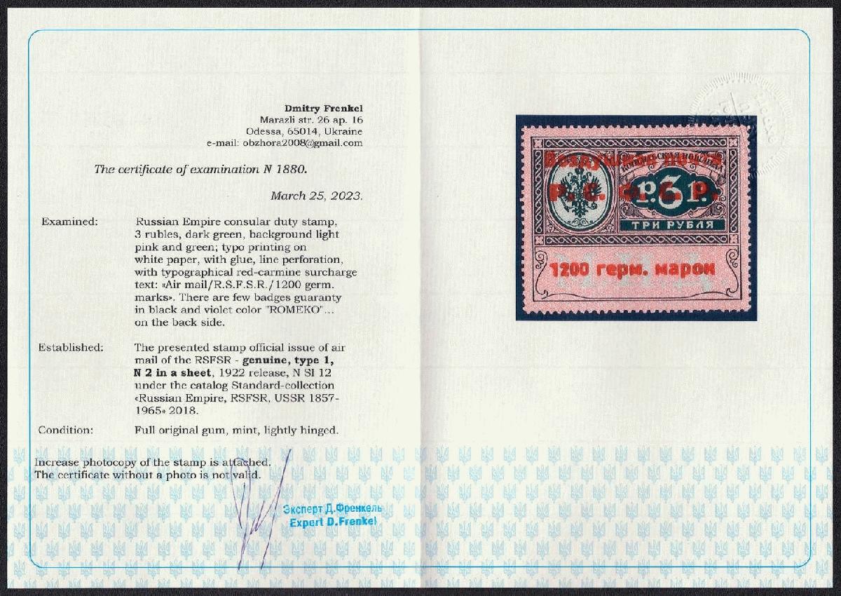 | Zusatzinformationen und Suchstichworte: | Oldlouis 30. Auktion - Russland, Territorien & Ukraine 4 - 7. Juli 2023 Los 665 Sowjetunion Konsulats Marken 1922 1200 Germ Mark Konsulatsgebührenmarke, Luftpost, RSFSR, Russland (Zag. SI 12, Zv. C8, Type I, Position. 2, Attest, signiert, CV $3,750). Ungebraucht Ausruf 1.200,00 USD |