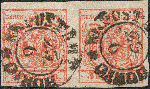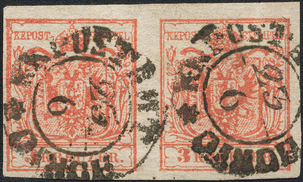 | Zusatzinformationen und Suchstichworte: | 16. Auktion Stilus 6. August 2023 Los 336 Österreich Ausgabe 1850 Österreich, Böhmen, 1850, ANK-Nr. 3 H IIIa, 3 Kreuzer, 'rot', Paar, 2x gut abgeschlagen; 'K. K. POSTAMT HORIC', Müller 1036c = 2x 60 Punkte, rechte Marke mit senkrechtem Bruch, Befund Babor VÖB Ausruf 40,00 EUR |