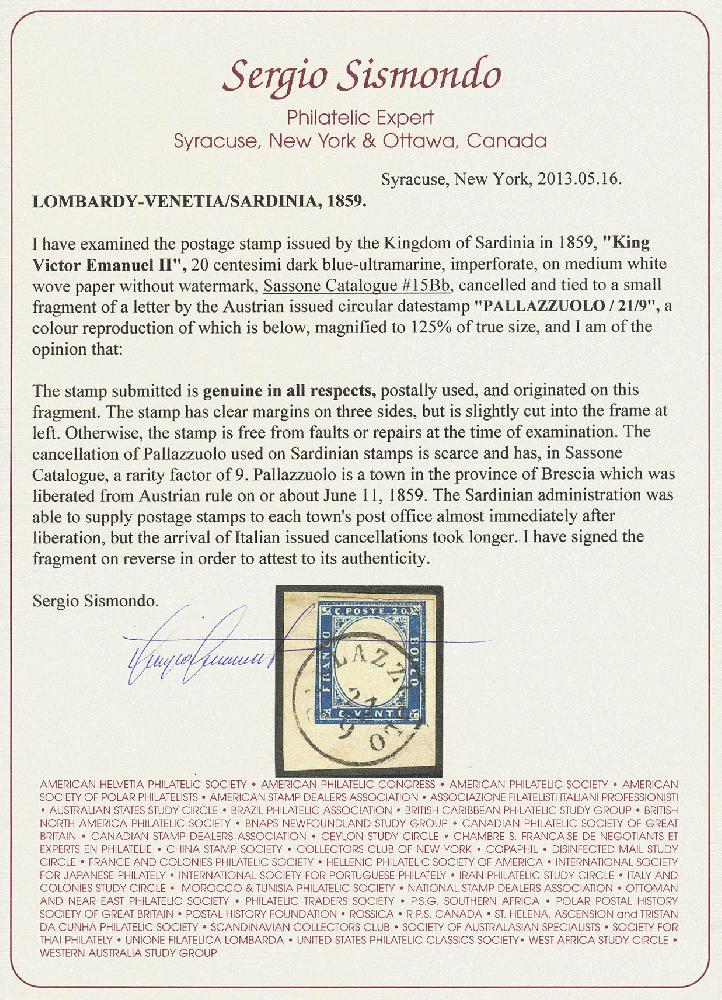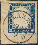 | Zusatzinformationen und Suchstichworte: | 16. Auktion Stilus 6. August 2023 Los 292 Italien Staaten Sardinien Italien, Sardinien mit Lombardei-Stempel, Pallazzuolo, 1855/62, Sassone-Nr. 15Bb, 20 Centesimi, 'blau', kompletter Einkreis von; 'PALLAZZUOLO', Sassone = 9 Punkte, auf Briefstück, links berührt, gute Erhaltung Ausruf 60,00 EUR |