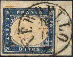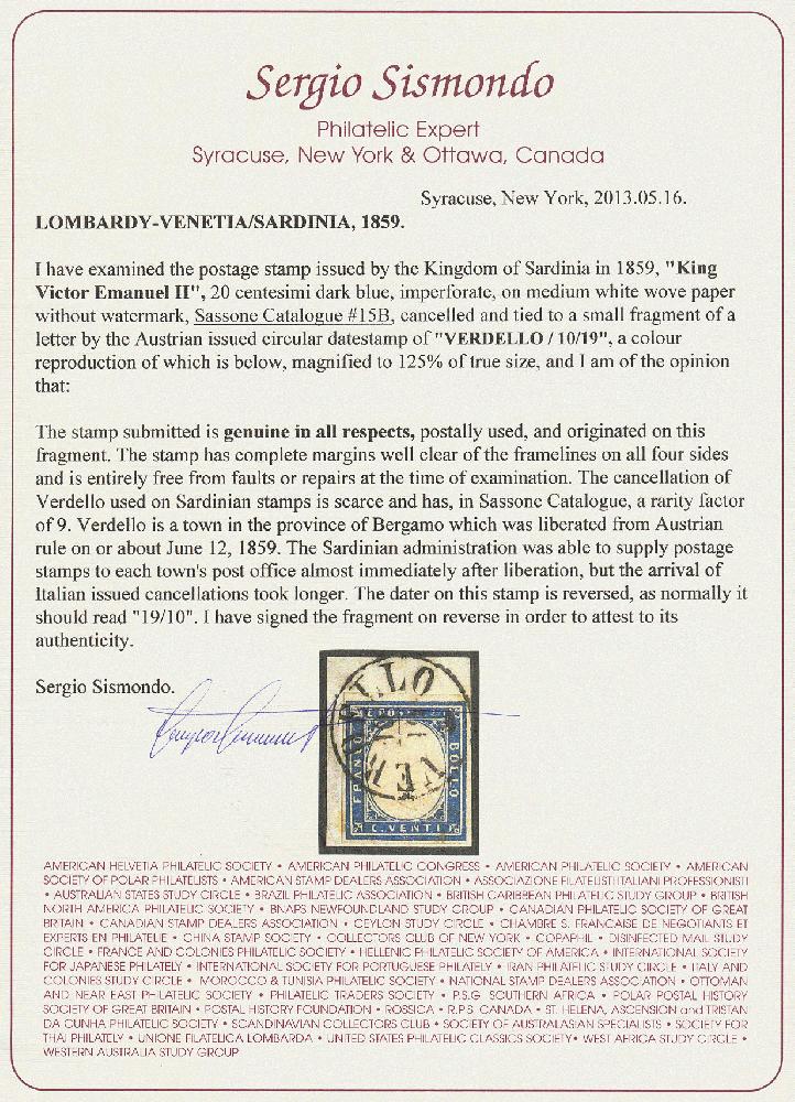| Zusatzinformationen und Suchstichworte: | 16. Auktion Stilus 6. August 2023 Los 303 Italien Staaten Sardinien Italien, Sardinien mit Lombardei-Stempel, Verdello, 1855/62, Sassone-Nr. 15B, 20 Centesimi, 'blau', inschriftkompletter Einkreis von; 'VERDELLO', auf Briefstück, Sassone = 9 Punkte, etwas fleckig, gute Erhaltung Ausruf 50,00 EUR |