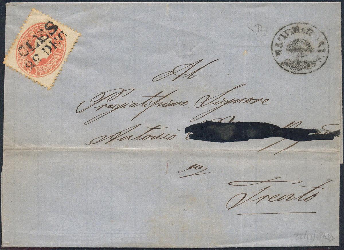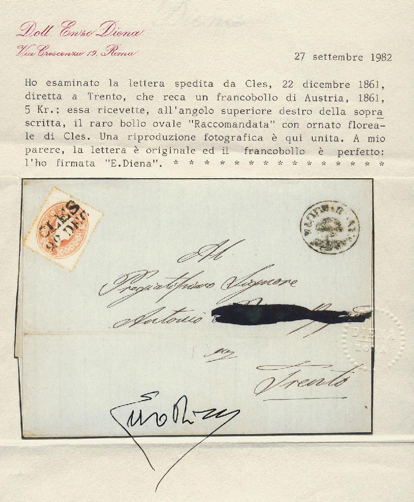 | Zusatzinformationen und Suchstichworte: | 16. Auktion Stilus 6. August 2023 Los 577 Österreich Ausgabe 1860 Österreich, Südtirol, 1860/61, ANK-Nr. 20, 5 Kreuzer, 'rot', kompletter Zweizeiler von; 'CLES', Müller 425a = 5 Punkte, auf Reko-Faltbriefhülle mit seltenem Reko-Nebenstempel; 'RACCOMANDATA', Müller 3723e, nach Trento gelaufen, rückseitig Ankunftsstempel, Reko-Marke fehlt, gute Erhaltung Ausruf 75,00 EUR |