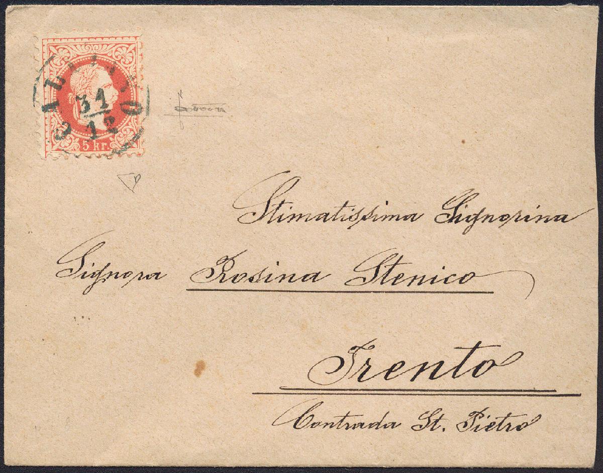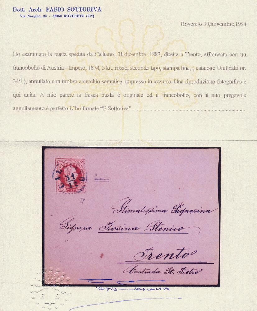 | Zusatzinformationen und Suchstichworte: | 16. Auktion Stilus 6. August 2023 Los 583 Österreich Ausgabe 1867 Österreich, Südtirol, 1867, ANK-Nr. 37 II, 5 Kreuzer, 'rot', feiner Druck, mit seltenem blauem Rundstempel; 'CALLIANO 31/12', Klein 590a = als Blaustempel nicht gelistet, auf Briefhülle nach Trento, rückseitig Ankunftsstempel, einwandfreie Erhaltung Ausruf 80,00 EUR |