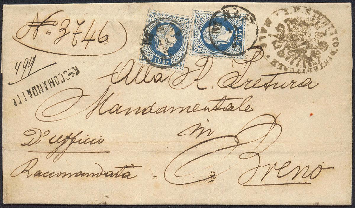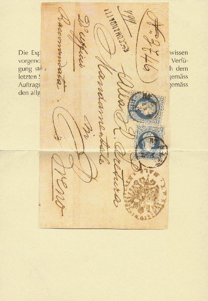 | Zusatzinformationen und Suchstichworte: | 16. Auktion Stilus 6. August 2023 Los 584 Österreich Ausgabe 1867 Österreich, Südtirol, 1867, ANK-Nr. 38 II (2), 10 Kreuzer, 'blau', feiner Druck, Rundstempel von; 'MALE', Klein 2847b = 2x 8 Punkte, mit Nebenstempel 'RACCOMANDATTA', auf Faltbrief nach Breno, AK-Stempel rückseitig Ausruf 50,00 EUR |