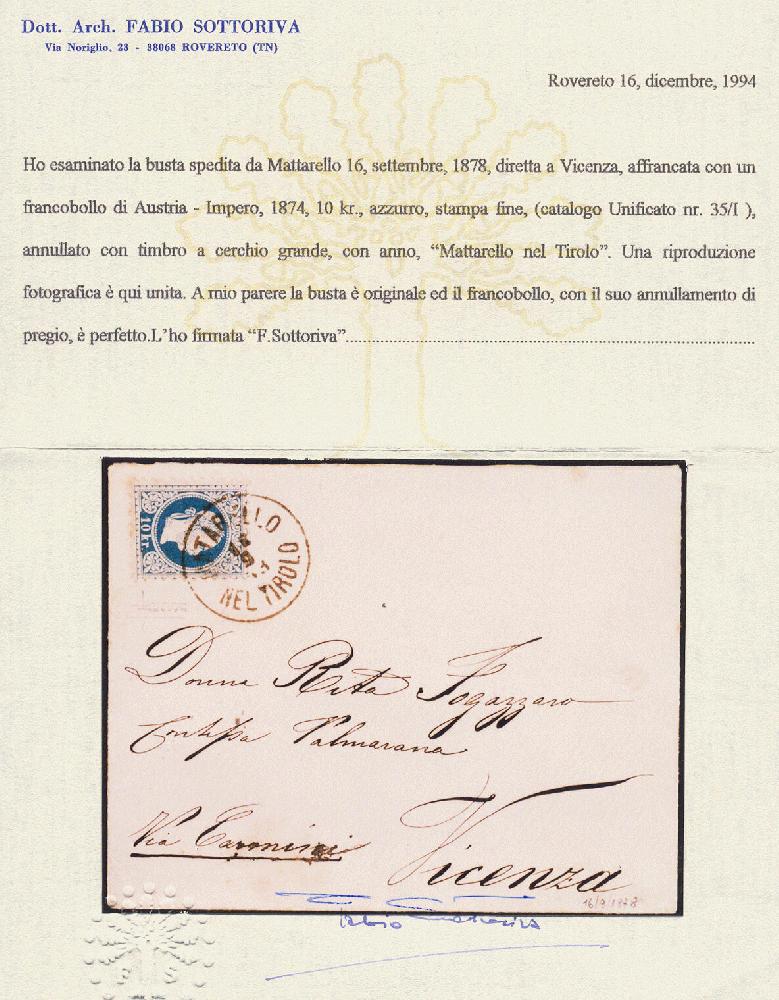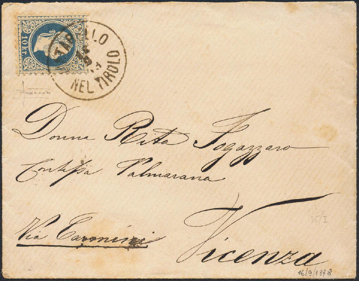| Zusatzinformationen und Suchstichworte: | 16. Auktion Stilus 6. August 2023 Los 586 Österreich Ausgabe 1867 Österreich, Südtirol, 1867, ANK-Nr. 38 II, 10 Kreuzer, 'blau', feiner Druck, mit komplettem Rundstempel von; 'MATARELLO NEL TIROLO', Klein 2923a = 35 Punkte, auf Kuvert nach Vicenza, etwas fleckig, einwandfrei Ausruf 36,00 EUR |