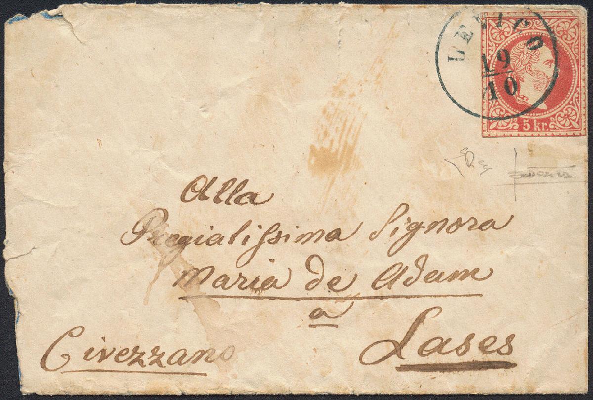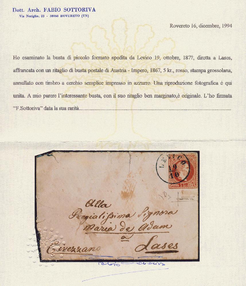 | Zusatzinformationen und Suchstichworte: | 16. Auktion Stilus 6. August 2023 Los 590 Österreich Abstempelungen Südtirol Österreich, Südtirol, 1867, Ganzsachenausschnitt zu 5 Kreuzer, 'rot', als Freimarke gebraucht, klarer blauer inschriftkompletter Rundstempel von; 'LEVICO', Klein 2635a = 70 Punkte, auf unbeanstandetem Kuvert nach Lases, Kuvert mit Öffnungsmängel Ausruf 60,00 EUR |