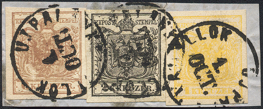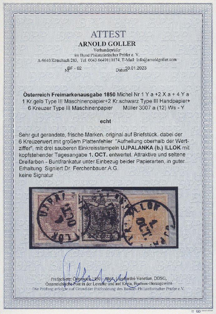 | Zusatzinformationen und Suchstichworte: | 16. Auktion Stilus 6. August 2023 Los 626 Österreich Ausgabe 1850 Österreich, Woiwodschaft Serbien, 1850, ANK-Nr. 1 M III + 2 H III + 4 M III, 1 + 2 + 6 Kreuzer, 6 Kreuzer mit großem Plattenfehler, 3-Farben-Buntfrankatur (Handpapier & Maschinenpapier), drei relativ klare Einkreisstempel mit kopfstehendem Datum von; 'UJPALANKA b. ILLOK', Müller 3007b = 15 Punkte, auf Briefstück, einwandfreie Erhaltung, selten Ausruf 500,00 EUR |