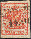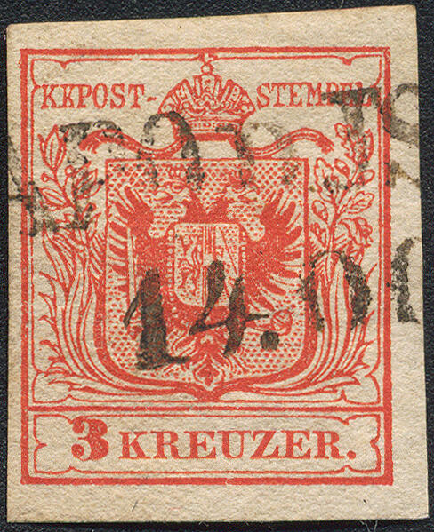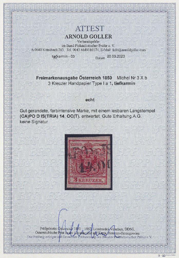 | Zusatzinformationen und Suchstichworte: | 16. Auktion Stilus 6. August 2023 Los 674 Österreich Ausgabe 1850 Österreich, 1850, ANK-Nr. 3 H Ia1, 3 Kreuzer, 'tiefkarmin', Teilstempel von; 'CAPO D'ISTRIA' (Küstenland), Müller 388a = 6 Punkte, einwandfreie Erhaltung, selten Ausruf 220,00 EUR |