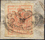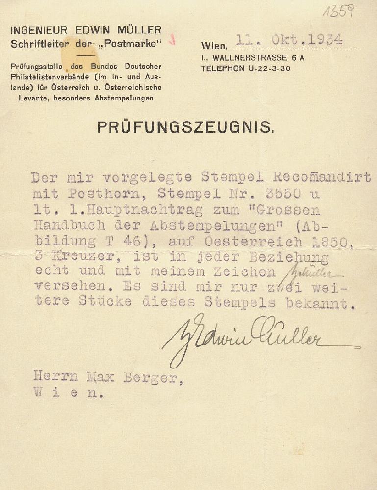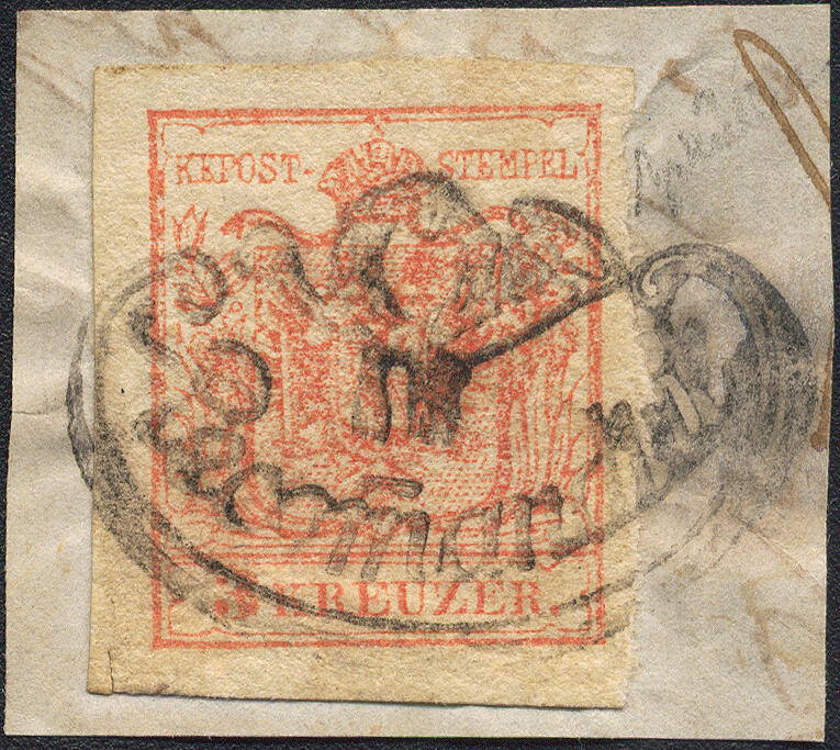 | Zusatzinformationen und Suchstichworte: | 16. Auktion Stilus 6. August 2023 Los 675 Österreich Ausgabe 1850 Österreich, 1850, ANK-Nr. 3 H IIIa, 3 Kreuzer, 'hellrot', kompletter Posthorn-Zierstempel; 'Recomandirt', Müller unbekannt, auf Briefstück, einwandfreie Erhaltung, sehr selten, ex Demuth, Prüfungszeugnis Müller, Attest Ferchenbauer, signiert Köhler, Wolfgang Schubert beschreibt im Handbuch 'REKOMMANDATIONSSTEMPEL DER ÖSTERREICHSICHEN POST', auf Seite 46 dieses dort abgebildete Stück (siehe Scan 5) Ausruf 800,00 EUR |