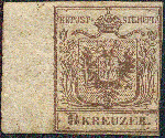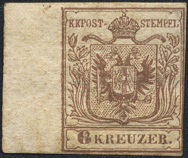 | Zusatzinformationen und Suchstichworte: | 16. Auktion Stilus 6. August 2023 Los 687 Österreich Ausgabe 1850 Österreich, 1850, ANK-Nr. 4 H Ia, 6 Kreuzer, 'graubraun', linkes Randstück 8 mm, ungebraucht * (mit teilen des Originalgummis), rechts unten berührt, Patina, gute Erhaltung Ausruf 200,00 EUR |