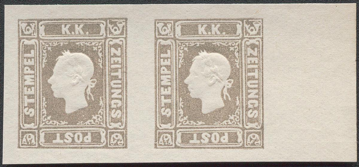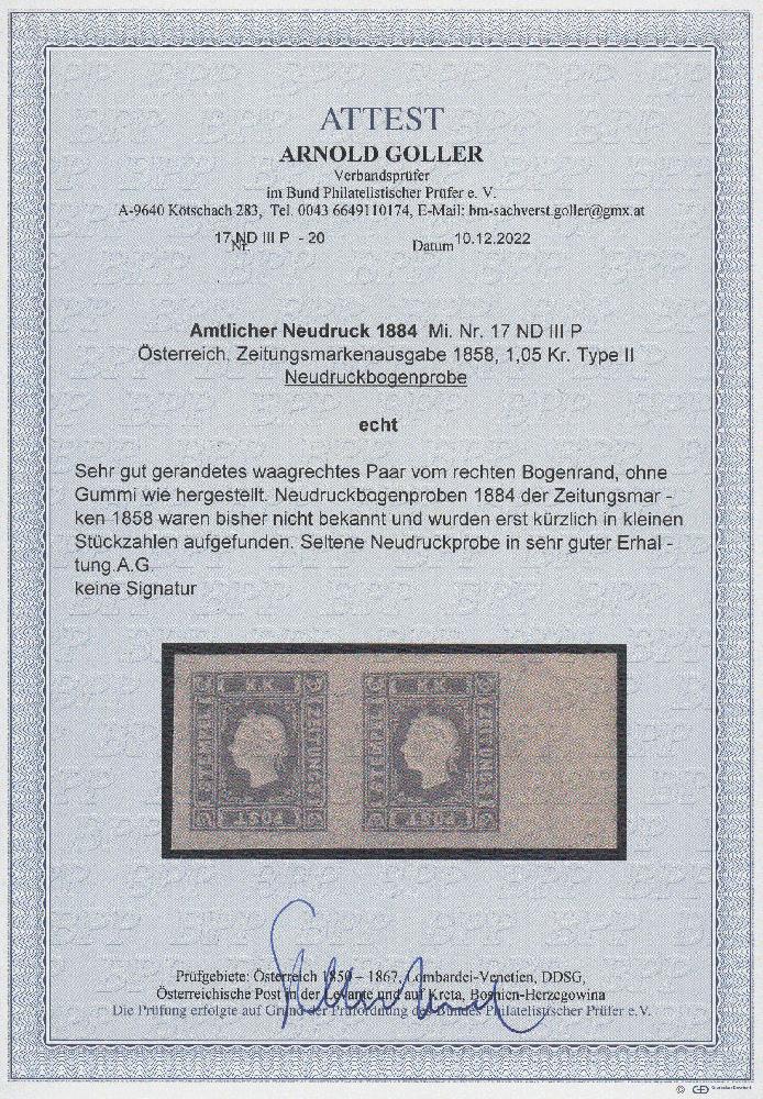 | Zusatzinformationen und Suchstichworte: | 16. Auktion Stilus 6. August 2023 Los 720 Österreich Zeitungsmarke 1858/59 Österreich, 1858, Zeitungsmarken, Amtlicher Neudruck, 1884, Michel-Nr. 17 ND III P, 1,05 Kreuzer bzw. Soldi, 'bräunlichgrau', Type II, Neudruckbogenprobe im waagrechten Rand-Paar, ungebraucht ohne Gummi wie hergestellt (*), sehr gute Erhaltung Ausruf 180,00 EUR |