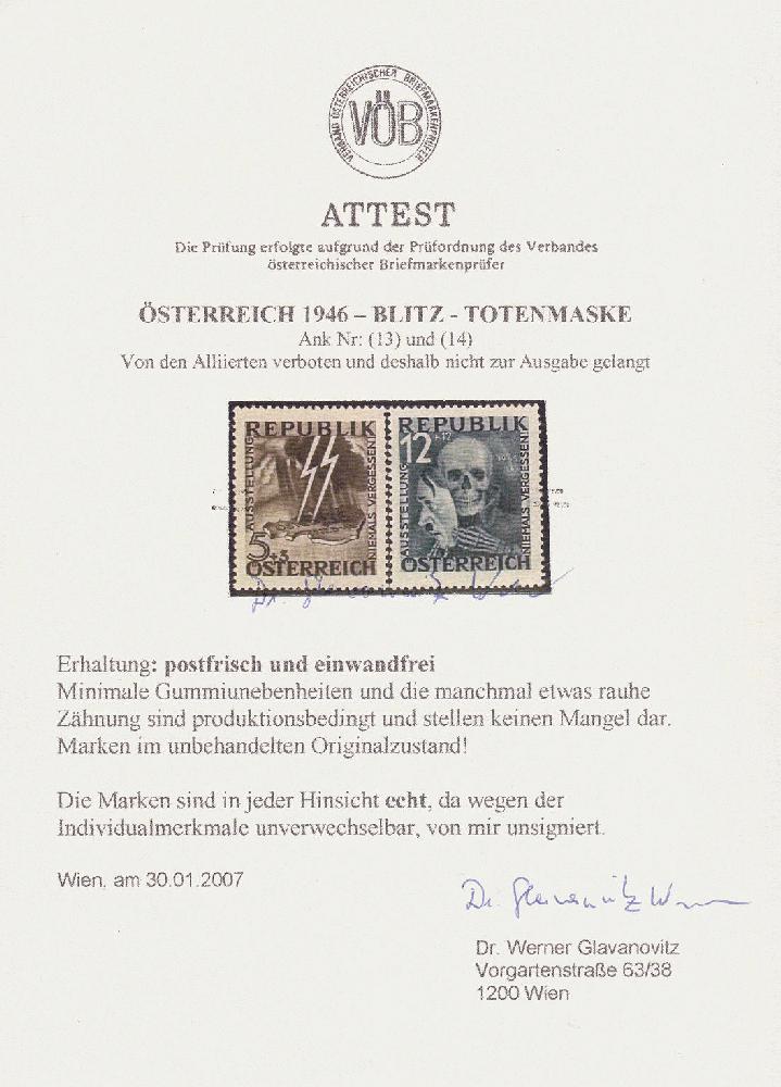 | Zusatzinformationen und Suchstichworte: | 16. Auktion Stilus 6. August 2023 Los 822 Österreich 2. Republik Österreich, 1946, ANK-Nr. (13) - (14), 'Blitz-Totenmaske', nicht zur Ausgabe gelangt, beide Werte komplett, postfrisch Ausruf 600,00 EUR |