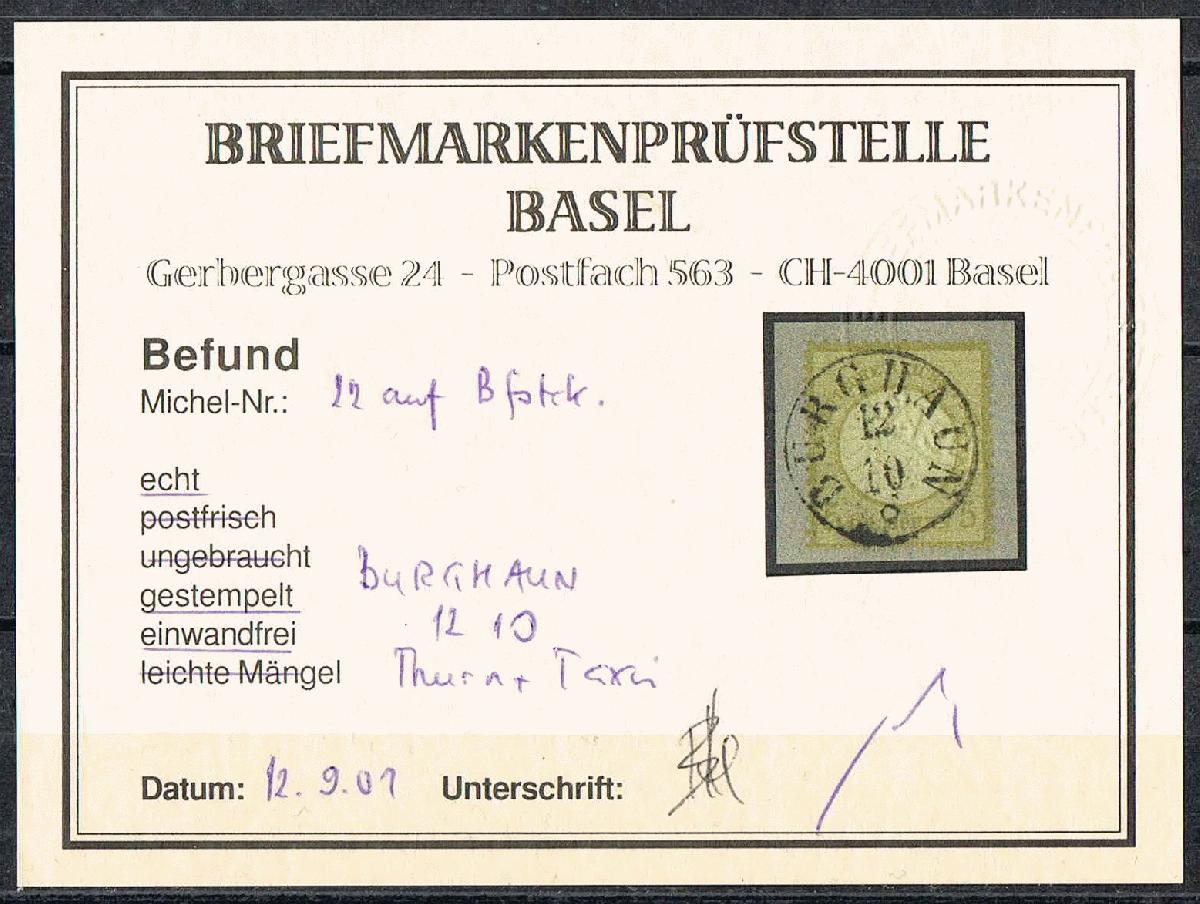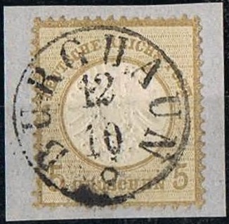 | Zusatzinformationen und Suchstichworte: | Deutsches Reich Mi-Nr. 22 auf Briefstück, Entwertung durch K1 BURGHAUN vom 12.10. (weiterverwendeter Handstempel Thurn und Taxis). |