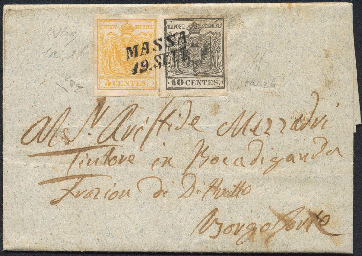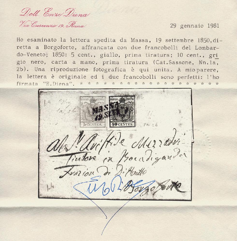 | Zusatzinformationen und Suchstichworte: | 16. Auktion Stilus 6. August 2023 Los 1404 Österreich Lombardei Venetien Österreich, LV, 1850, Venetien, Massa, ANK-Nr. 1 H Ie + 2 H Ie, 5 + 10 Centesimi, 'gelb' + 'silbergrau', je Erstdruck, kompletter klarer Zweizeilers von; 'MASSA', Müller 145a = 4 Punkte, Sassone 4 Punkte, patriotische Frankatur auf Faltbrief nach Borgoforte, einwandfrei, selten Ausruf 650,00 EUR |